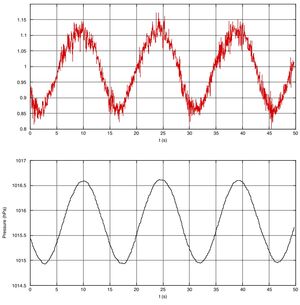 Grafen till höger visar hur den upplevda tyngden ändras under turen. (1 är som vanligt. 1.1 är 10% tyngre än vanligt). Den undre grafen visar hur lufttrycket samtidigt ändras eftersom man åker uppåt och nedåt. Data har samlats in på telefonen med appen Physics Toolbox Roller Coaster